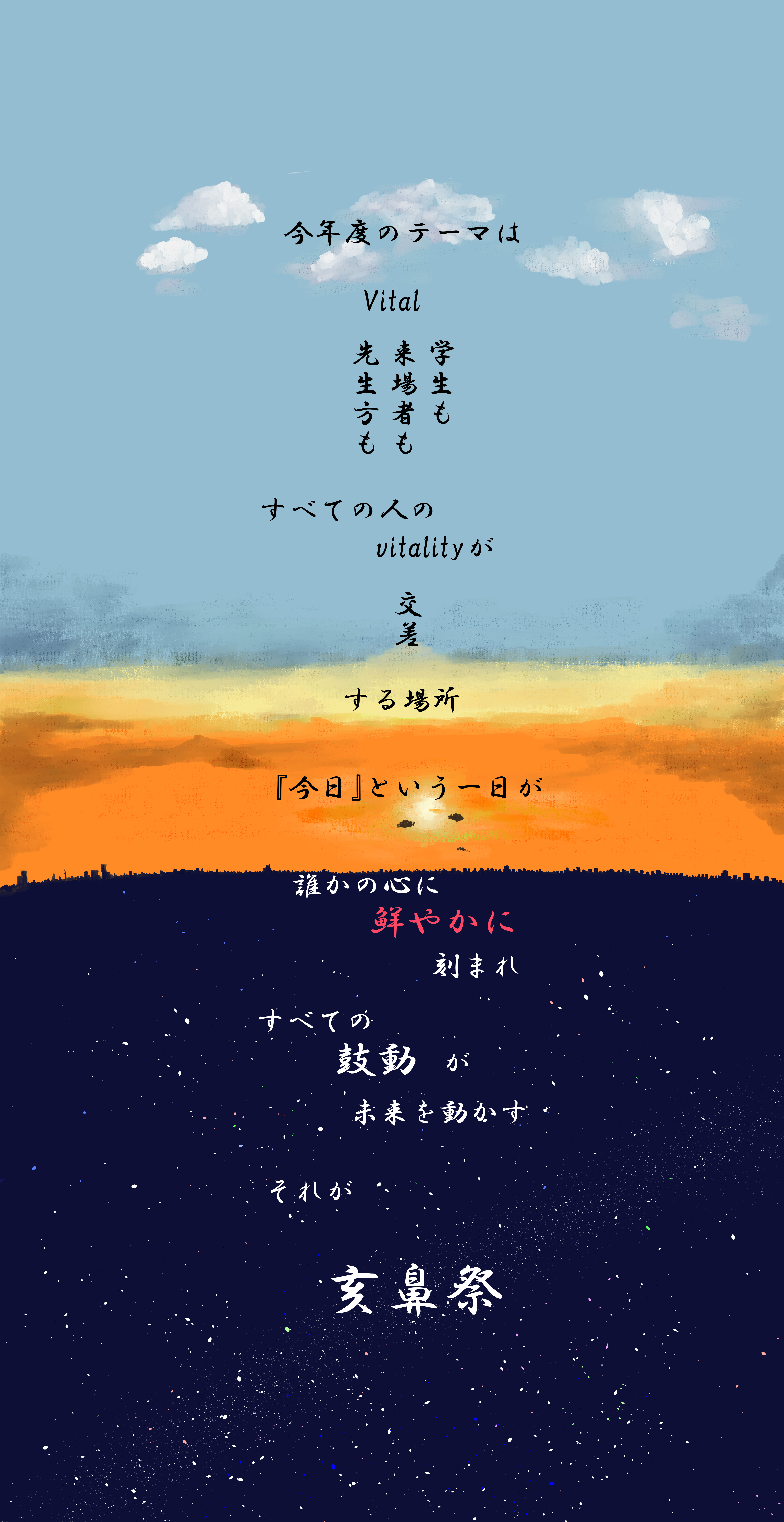 学生の無限の可能性と、支えてくださる皆さまの存在、そして来場されるすべての人のvitalityが交差し合い、生命力あふれる特別な大学祭を創り上げます。